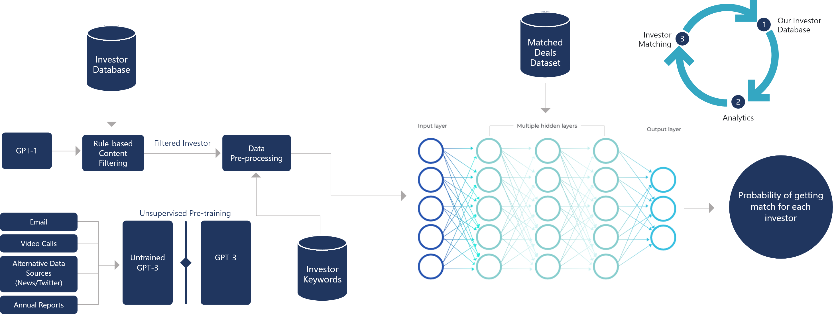 For each client, AI performs the functions of data collection, data updating, and data matching.The individualised process begins once the 30 most suitable investors are identified for each client.